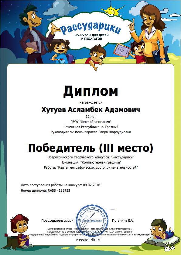 Педагоги и учащиеся Центра образования активно участвуют во многих Всероссийских дистанционных конкурсах и занимают призовые места. Хутуев Асламбек, учащийся 6 класса, победитель Всероссийского творческого конкурса «Рассударики» в номинации «Копьютерная графика» (III место). Его руководитель Ислангириева З. Ш., учитель информатики, также награждена Дипломом «За подготовку участника конкурса».