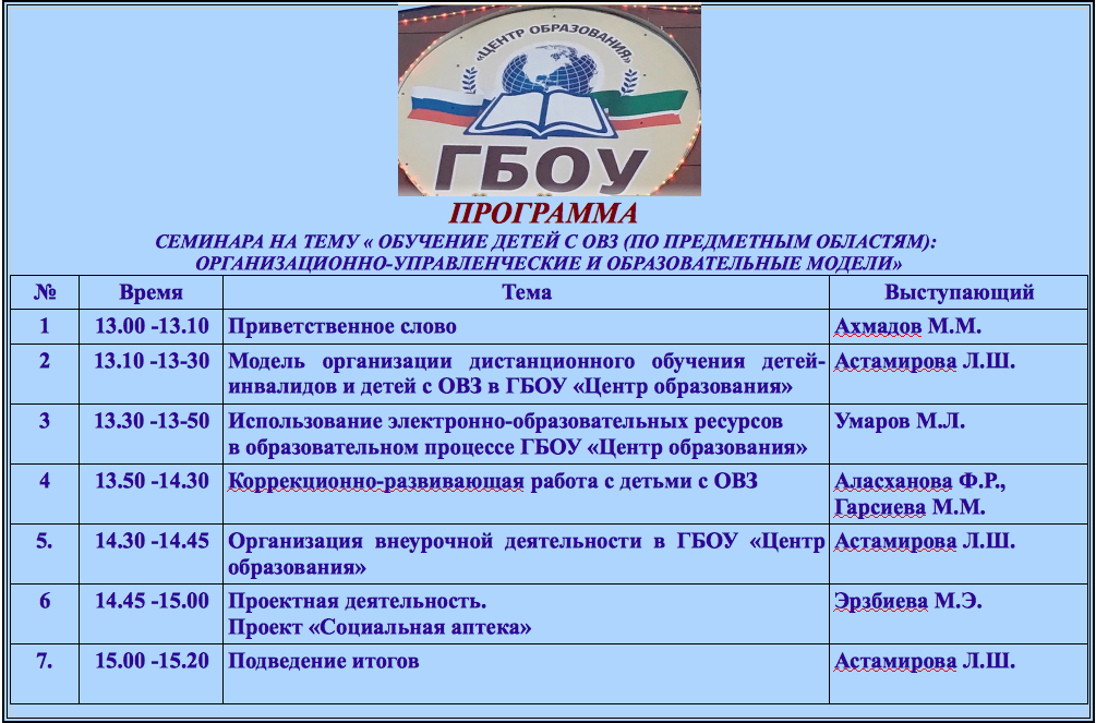 образовательные модели».Семинар был проведен на основании приказа Министерства образования и науки Чеченской Республики №388-п от 12.03.2020 г. «О реализации мероприятий по модернизации конкретных областей», в целях диссеминации опыта по организации дистанционного обучения детей инвалидов и детей с ОВЗ.На семинаре присутствовали работники районных отделов образования, учителя, психологи общеобразовательных учреждений ЧР. Тема семинара вызвала больший интерес среди присутствующих. Участники выразили благодарность организаторам семинара за содержание и актуальность темы.